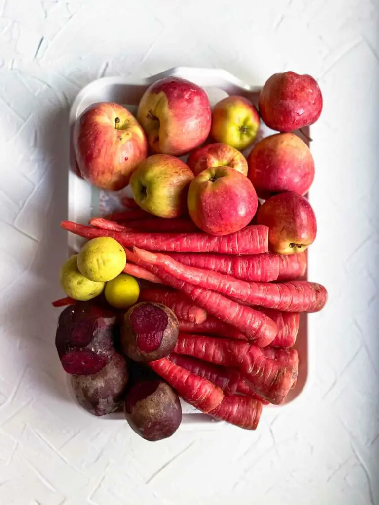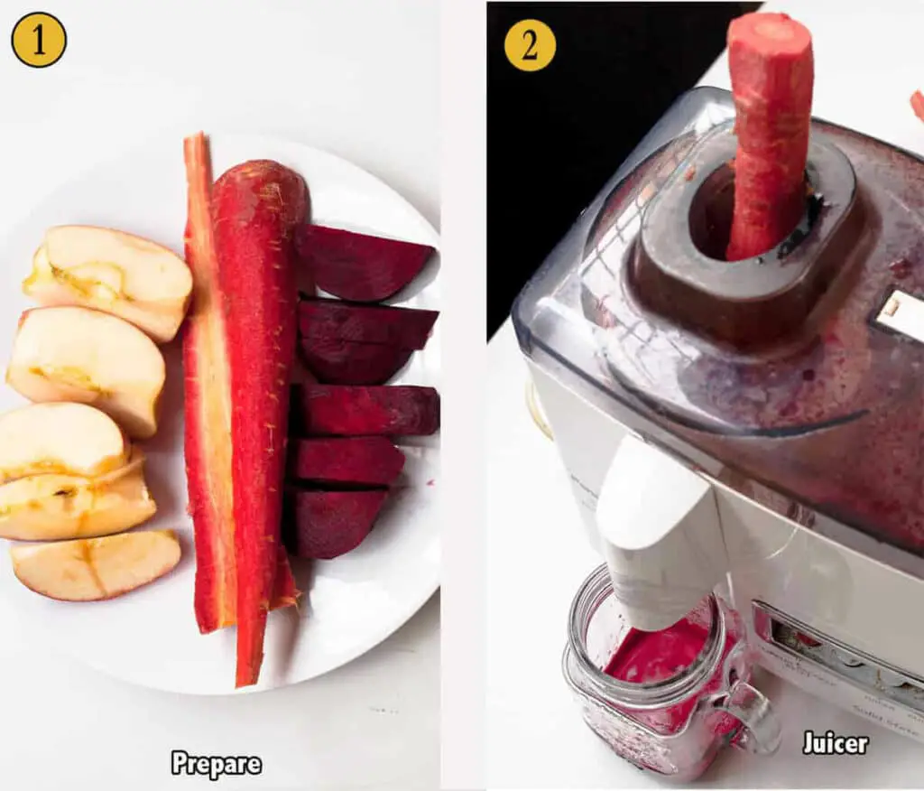 Keep all ingredients in the fridge overnight so the juice that comes out is cold. You can make Apple beet carrot juice in a juicer or blender. I personally prefer a juicer because it is quick, and I can make liters of juice for the whole family in no time.