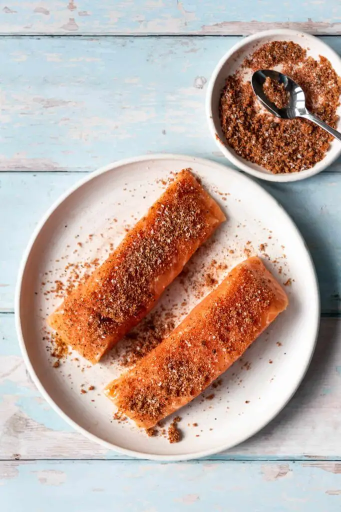 - Spices: Use the classic dry rub below that is a blend of sweet and savory with brown sugar, salt, black pepper, garlic powder, and smoked paprika or chili powder, or go with your favorite premade seasoning blend in the cupboard. Really almost any seasoning blend works well with salmon, from simple blends like lemon pepper or Cajun seasoning to taco seasoning, bbq rub, and more.