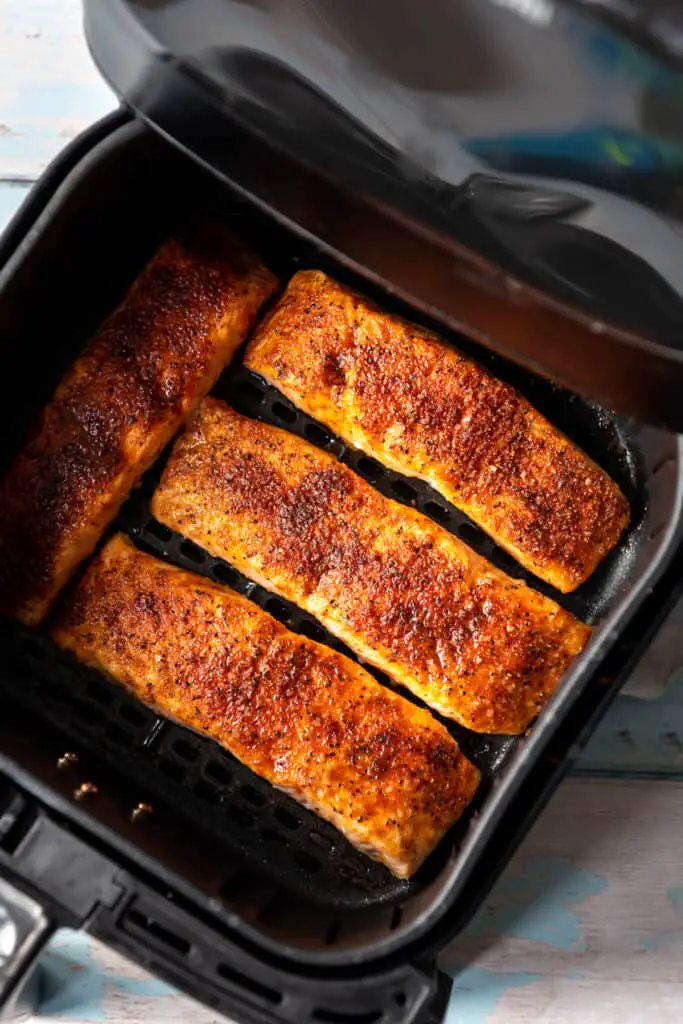 Salmon should be cooked to an internal temperature of 145 degrees F when tested with a digital meat thermometer in the thickest part of the salmon. However, keep in mind that the temperature of the salmon will continue to rise another 5-10 degrees F for about 5 minutes after removing it from the air fryer, so it’s best to take it out when it’s around 135-140°F and let it come up the rest of the way so that it doesn’t dry out.