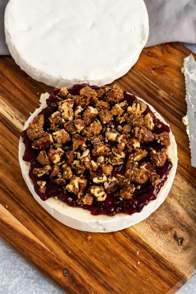 - Cut brie in half and place bottom half on puff pastry. Sandwich the jam and pecans in between the two brie halves, with rind facing outward.
