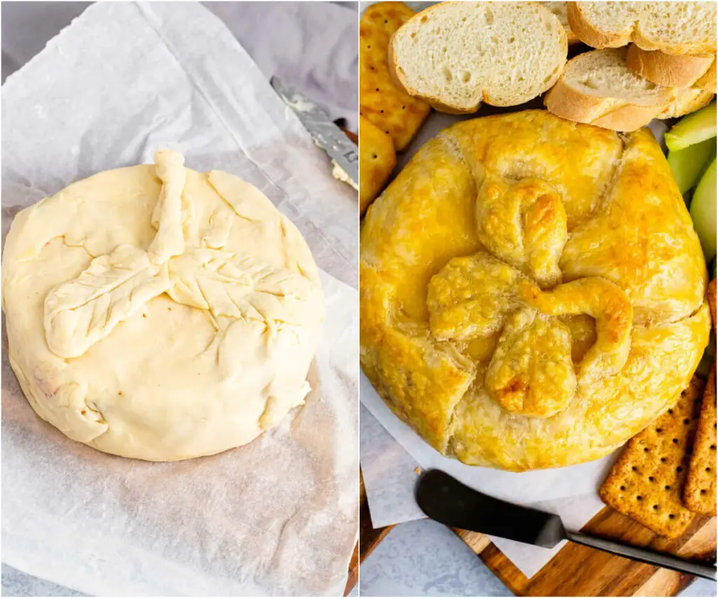 - Fold puff pastry around the brie and brush with an egg wash. Freeze for an hour, then bake for 25 minutes. Remove from oven, let cool, and enjoy!