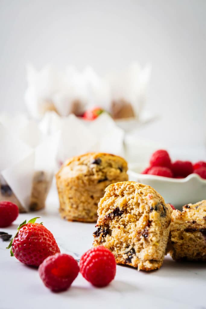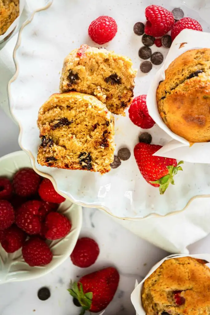 Make ahead: You can prepare the batter, minus the leavening agents and berries, up to a day in advance. Leave it covered in the refrigerator and mix in the baking powder and baking soda, strawberries and chocolate chips before baking the muffins.
