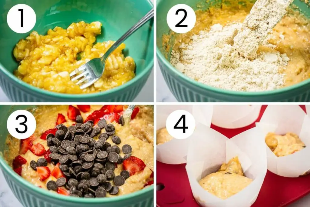 - Make batter: Add almond flour and oat flour and mix with spatula. Stir in strawberries and chocolate chips until just incorporated.