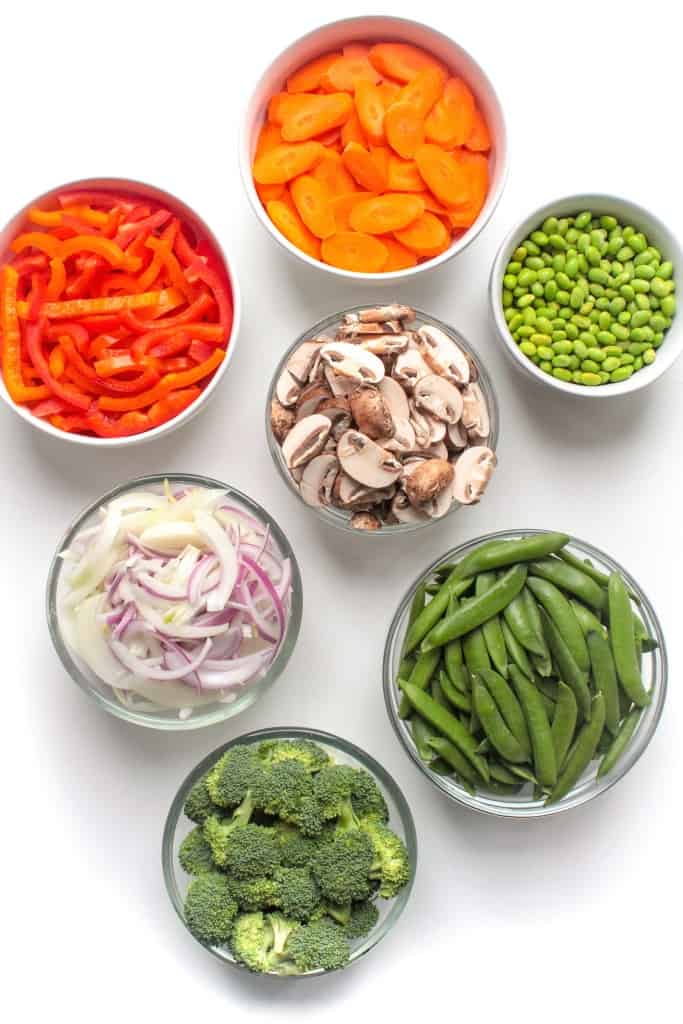 You can also par-cook heartier veggies like broccoli and carrots in the microwave with a splash of water for 1-2 minutes before stir-frying them in the pan, if desired.