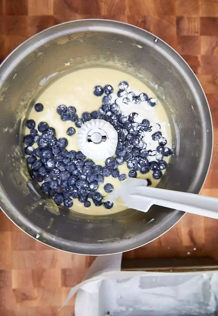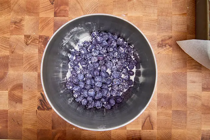 - To a bowl, add the blueberries and reserved flour. Gently mix to coat the berries with the flour. Remove the paddle or mixer blades and add in the coated blueberries plus any residual flour in the bowl. Gently mix.