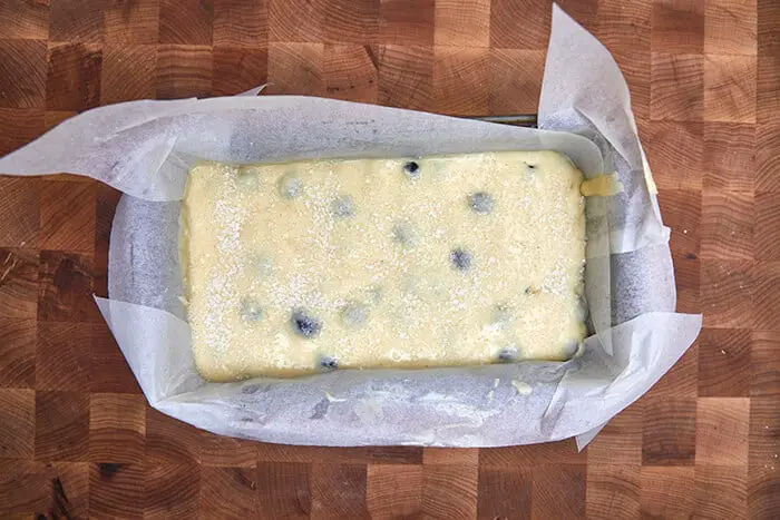 7. Pour the batter into the loaf pan and sprinkle the coarse sugar over top.