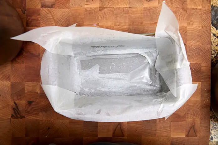 - Preheat the oven to 350F, rack in the middle. Line and lightly spray and nonstick bread loaf pan with parchment paper.