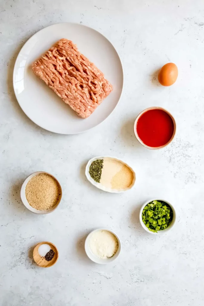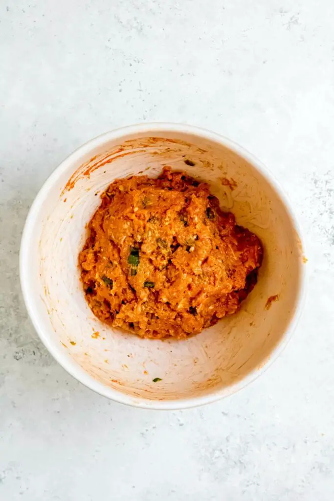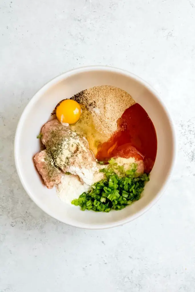 - Mix ground chicken, breadcrumbs, ¼ cup buffalo sauce, green onion, cheese, spices, and egg in a large bowl until well combined.