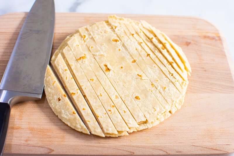 - Tortillas: Corn tortillas, cut into thin strips, to make tortilla strips for topping. Corn tortillas are more thick and hearty than wheat tortillas. You can also use store-bought tortilla strips.