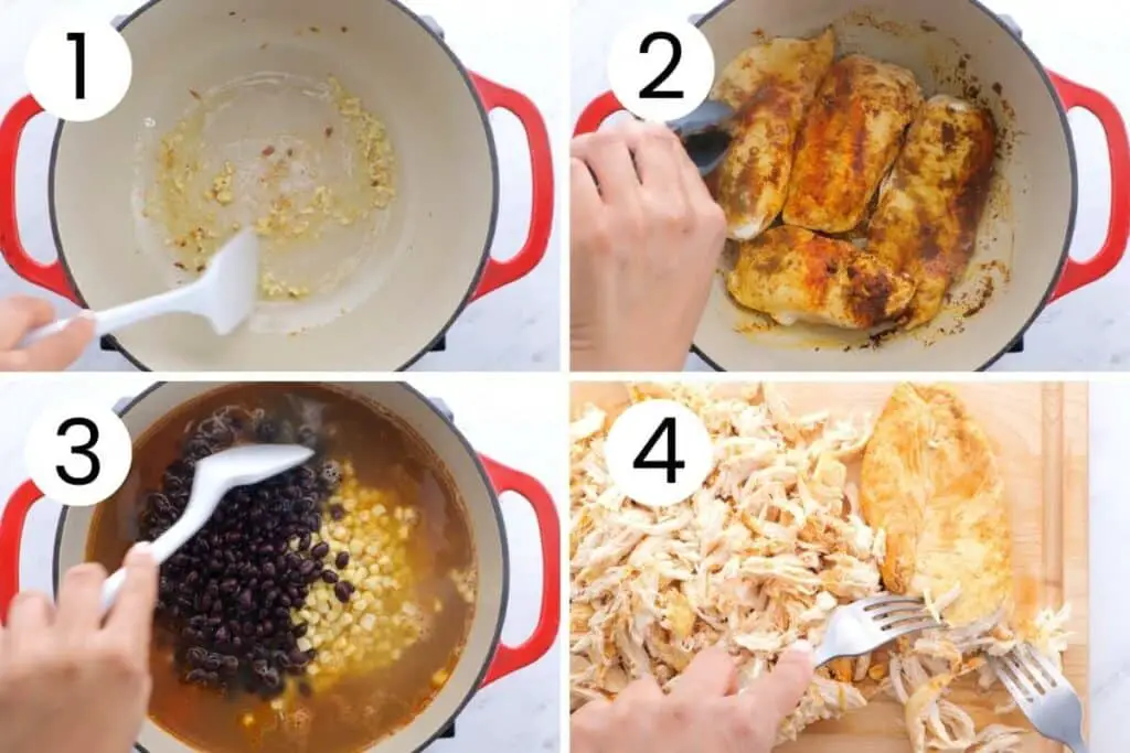 Here is a quick overview how to make healthy chicken tortilla soup in one pot. Find instructions how to make homemade tortilla strips right down below. Full recipe card is located at the end of this post as well.