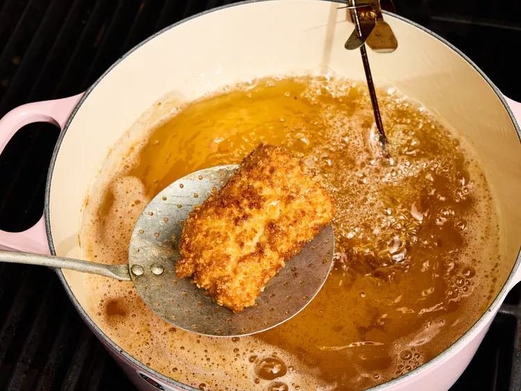 - Gather all ingredients. Pour oil to a depth of 2 inches in a large Dutch oven; heat oil over medium-high to 360 degrees F (182 degrees C). Preheat oven to 200 degrees F (93 degrees C). Set a wire rack inside a large rimmed baking sheet; set aside.