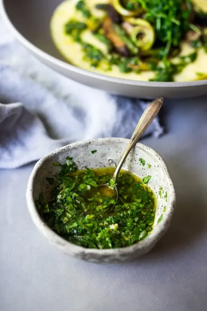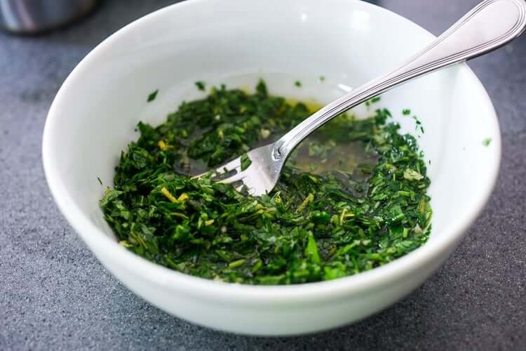 - Place chopped parsley, garlic, zest, lemon juice, olive oil, salt and pepper in a small bowl. Give a stir. Taste. Add more lemon juice if you like. (You want this salty and lemony.) If you want a looser consistency add a little more oil. Add a pinch of chili flakes for heat.