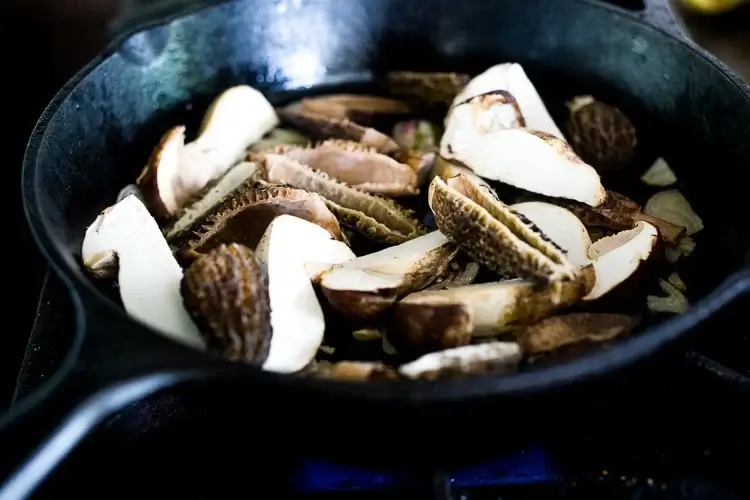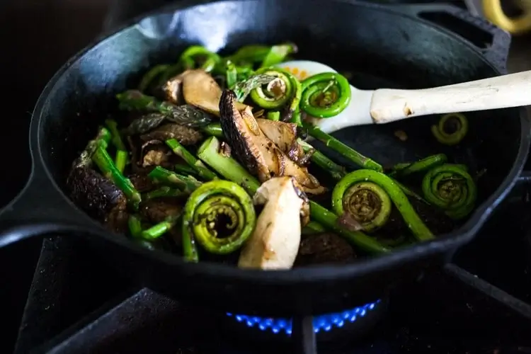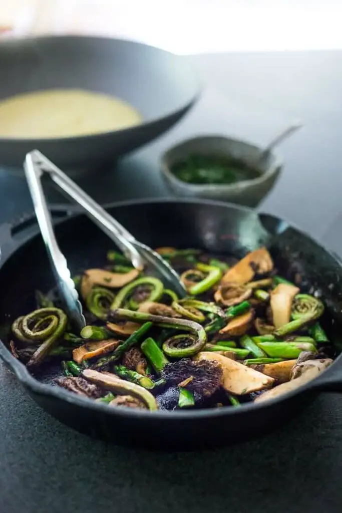 Next you’ll sauté your veggies. Start with the mushrooms, then add the shallot, asparagus and fiddle heads. Of course you can substitute other more accessible veggies just see the recipe notes. 🙂