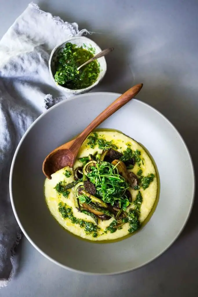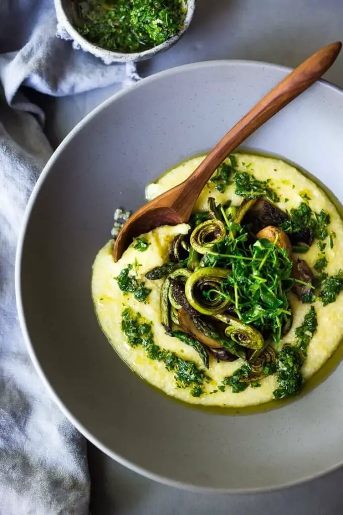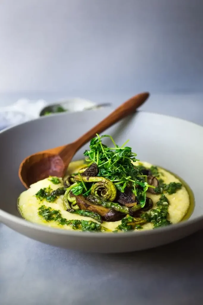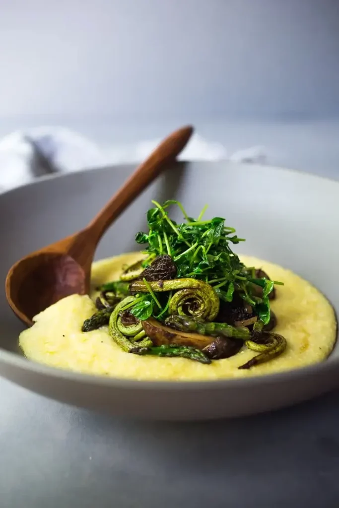 A simple elegant recipe for Creamy Polenta with Spring Veggies ( fiddlehead ferns, morel mushrooms and asparagus- or sub others!) and flavorful Gremolata – flavorful and health, featuring vibrant spring produce that can be made in under 30 minutes. Vegan & Gluten Free!