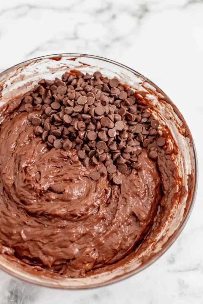 - In a separate mixing bowl combine dry ingredients and add to wet ingredients. Stir in the chocolate chips with a spatula. Mix on low until everything combines.