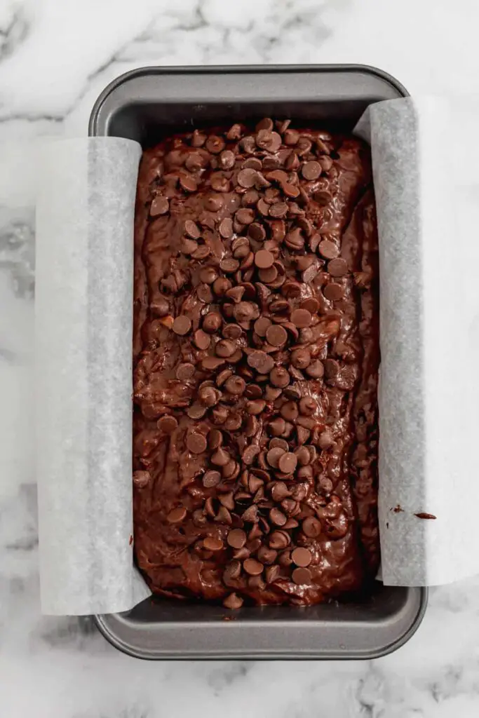 5. Pour into pan. Pour into a 9 x 5-inch loaf pan that has been greased or lined with parchment paper. Make a small cut lengthwise about ½ inch deep in the center of the bread. Decorate with chocolate chips.