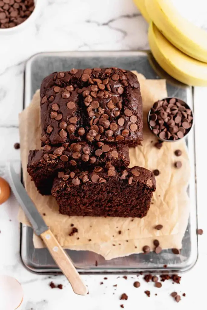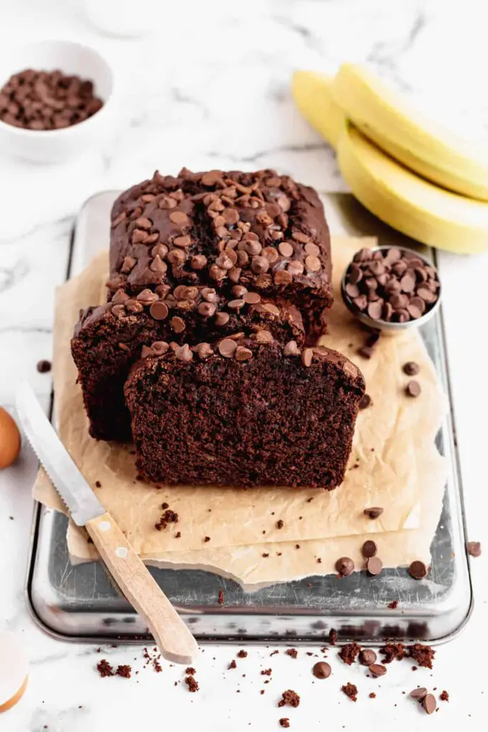 This delicious Double Chocolate Banana Bread recipe is decadent and sweet! With super moist crumbs, a rich chocolate flavor, and chocolate chips throughout the loaf, the top is covered with more chocolate chips for an extra special finish!