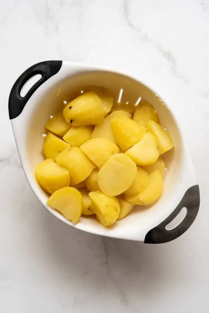 - Drain. Once the potatoes are easily pierced with a fork, drain them well in a colander.