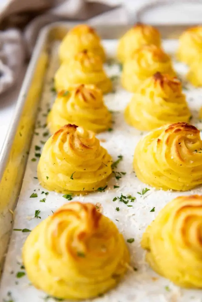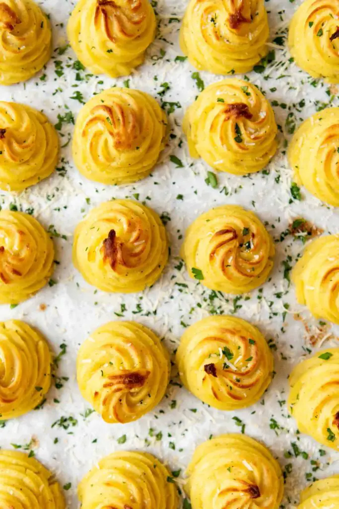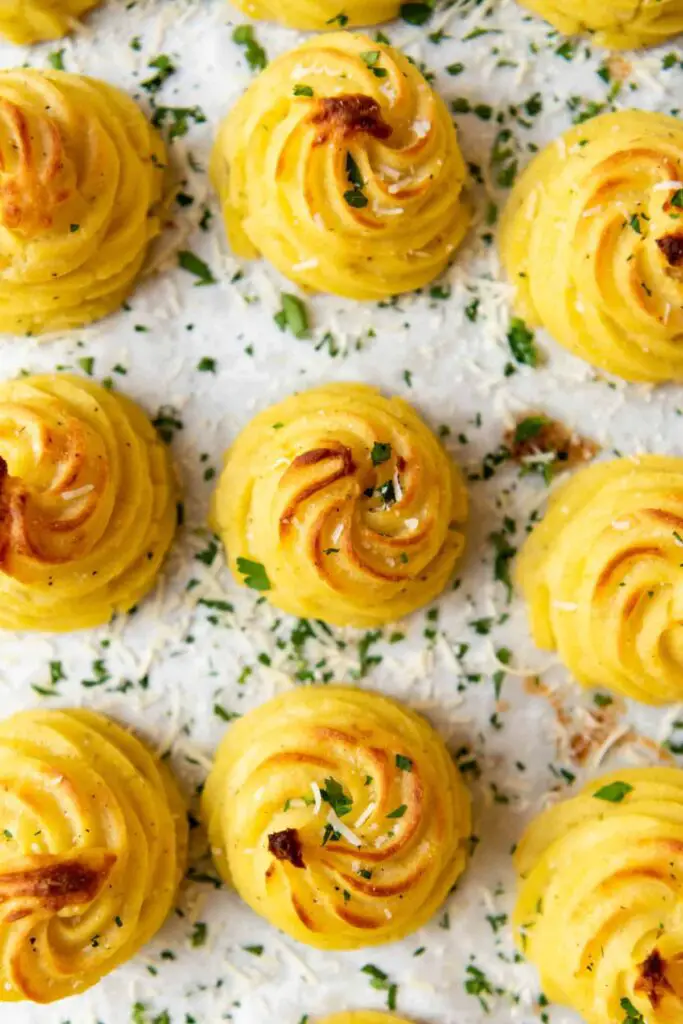 - Garnish & serve. Sprinkle the creamy duchess potatoes with chopped parsley and some additional Parmesan cheese before serving.