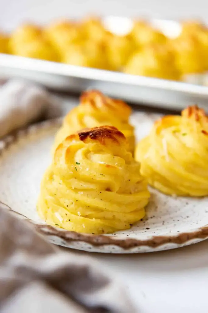 This elegant side dish originated from France in the 1700’s where it was called “pommes duchesse“. The added egg yolks give the mashed potatoes a velvety texture, wonderful golden color, and richness thanks to the added fat from the yolks.