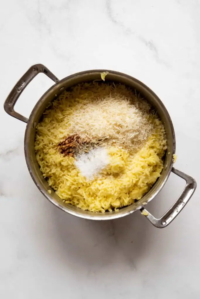 - Season. Add the freshly grated Parmesan cheese, kosher salt, pepper, and nutmeg then stir everything together by hand with a wooden spoon so as not to overmix the potato mixture.