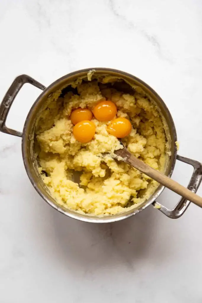 - Stir in egg yolks. It’s okay to add the egg yolks to the warm potatoes because by this point the potatoes should have cooled down quite a bit from when they were first drained. Otherwise the egg yolks could cook and scramble when you add them to the potatoes if they are still super hot.