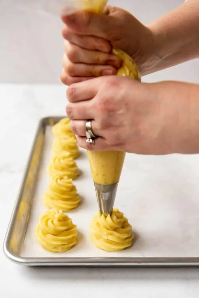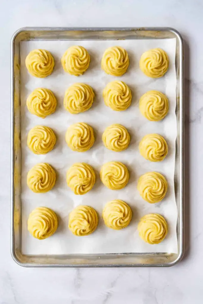 - Pipe. Fill a large piping bag or pastry bag fitted with a large star tip with some of the mashed potatoes. Piper generous mounds onto a baking sheet lined with parchment paper, swirling the potatoes for the classic duchess potato look. Repeat until all of the mashed potatoes have been used up. Alternatively, you could just spread the potatoes into a casserole dish and use a knife to create peaks for some texture if you want to avoid piping.