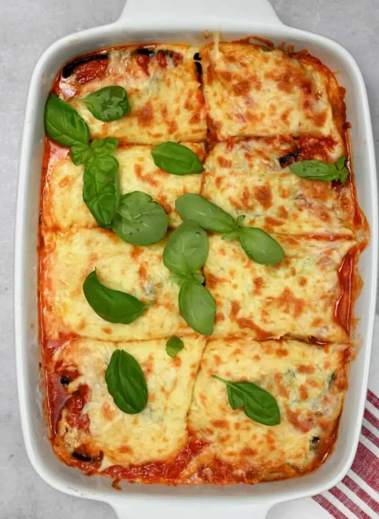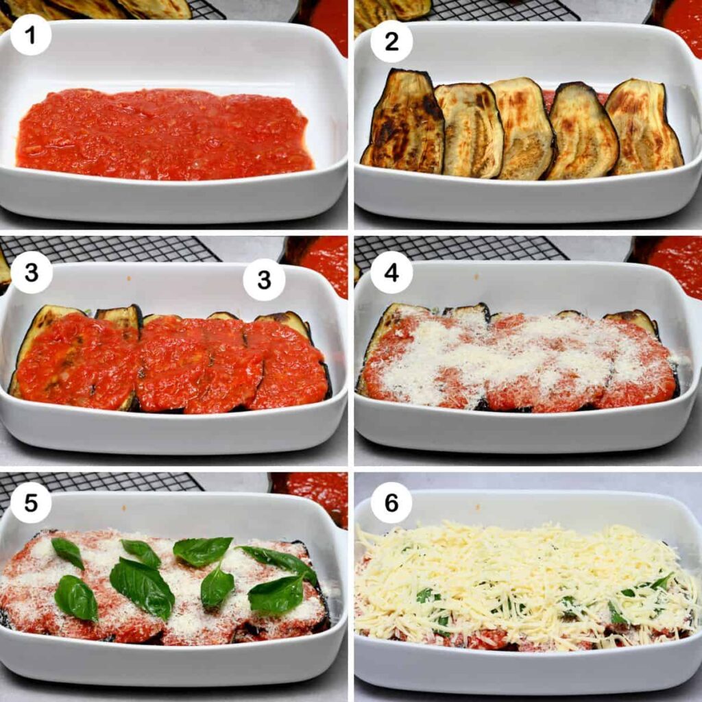 - In a large baking dish or casserole dish – I use a 9 x 13" size – spread a bit of the marinara sauce.Then arrange the first layer – add 1/3 of the eggplant slices on top (they can overlap a bit if needed). Top with more marinara sauce, 1/3 of the grated parmesan, and 1/3 of fresh basil leaves.