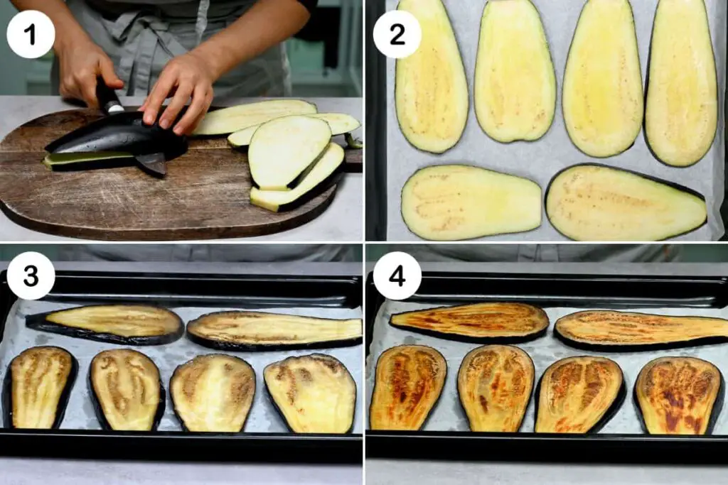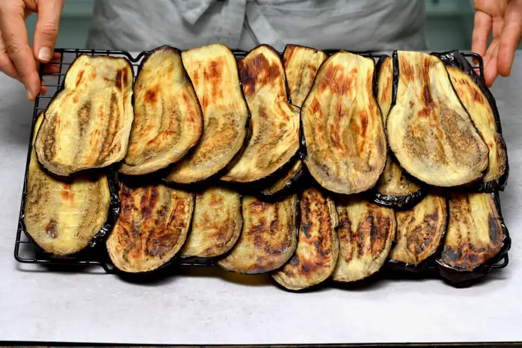 Once fully baked, set the eggplant slices aside to allow them to cool slightly.