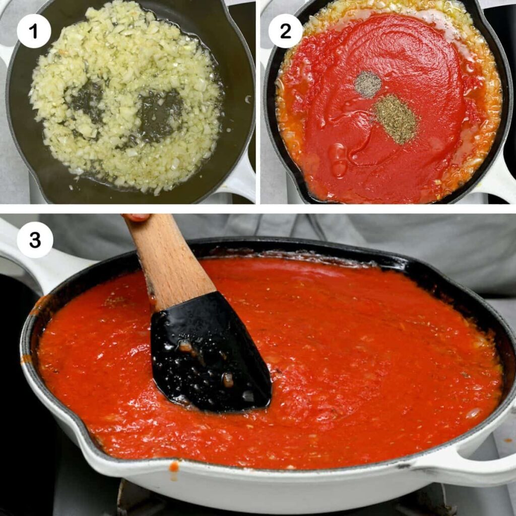 Cook the Marinara Sauce: Add the diced onions to a frying pan and sauté for a few minutes before adding in the garlic. Cook until the onion has turned translucent and you can smell the aroma of the garlic – 3-5 minutes.