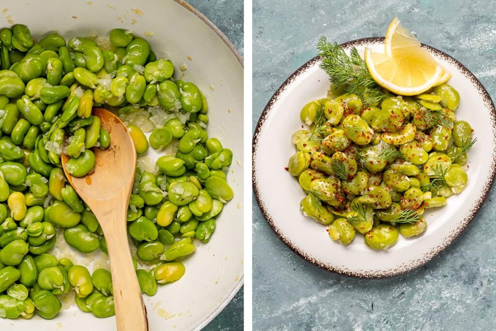 - Cool and garnish the beans. Remove the cooked fava beans from the heat and allow them to cool slightly. Add some freshly chopped dill and stir it in well. Serve with red pepper flakes, fresh dill, and some refreshing lemon slices.