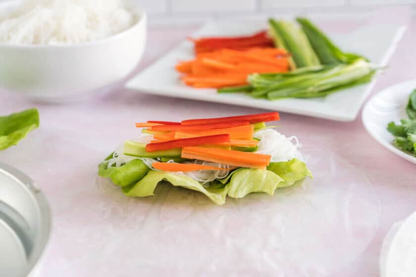 - Layer and fill – Quickly dunk the spring roll wrapper into the water and place it on your work surface. Layer lettuce, rice noodles, cilantro, mint, basil, and veggies on top of the wrapper.