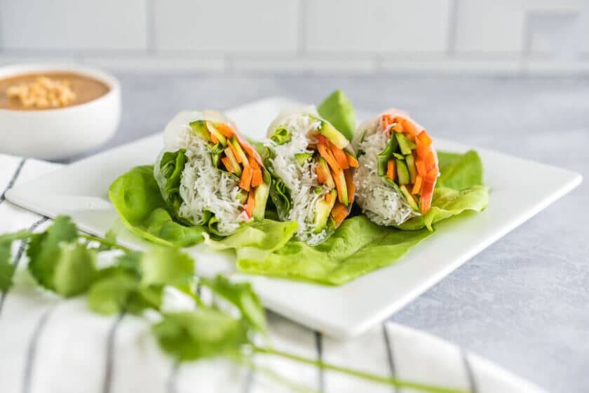 These are the best spring rolls that are layered together and wrapped in a thin rice wrapper. Slice and prepare the veggies ahead of time. Wet the wrappers and tightly wrap the filling ingredients to hold it all in. Serve chilled and dip into a savory and delicious peanut sauce for the perfect combination!