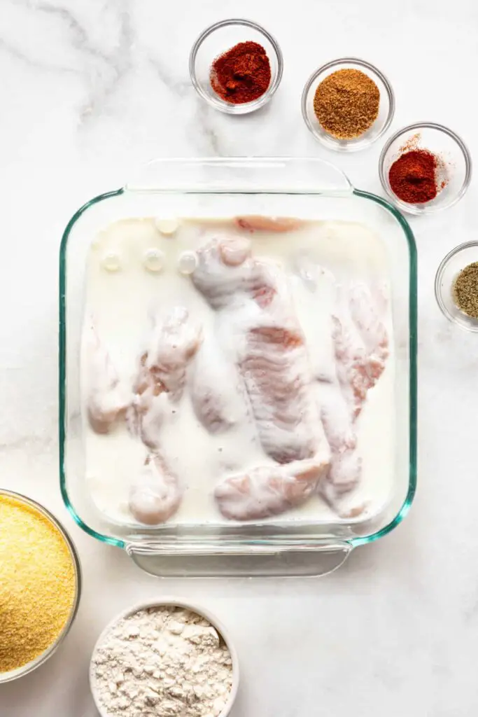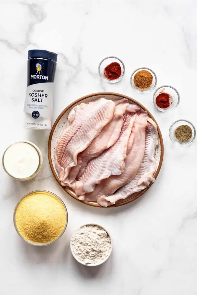 - Sprinkle the catfish filets with kosher salt on both sides. Place the seasoned filets in a shallow dish or resealable bag and cover with the buttermilk, turning to coat. Set aside to soak while preparing the rest of the ingredients and oil, or transfer to the fridge for up to 8 hours to marinate.