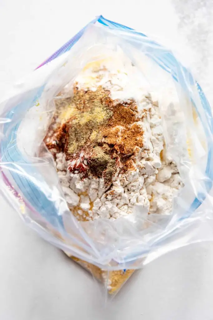 - Combine cornmeal, flour, seasoned salt, paprika, black pepper, and cayenne pepper in a large resealable ziplock bag. Whisk or toss to evenly disperse spices.
