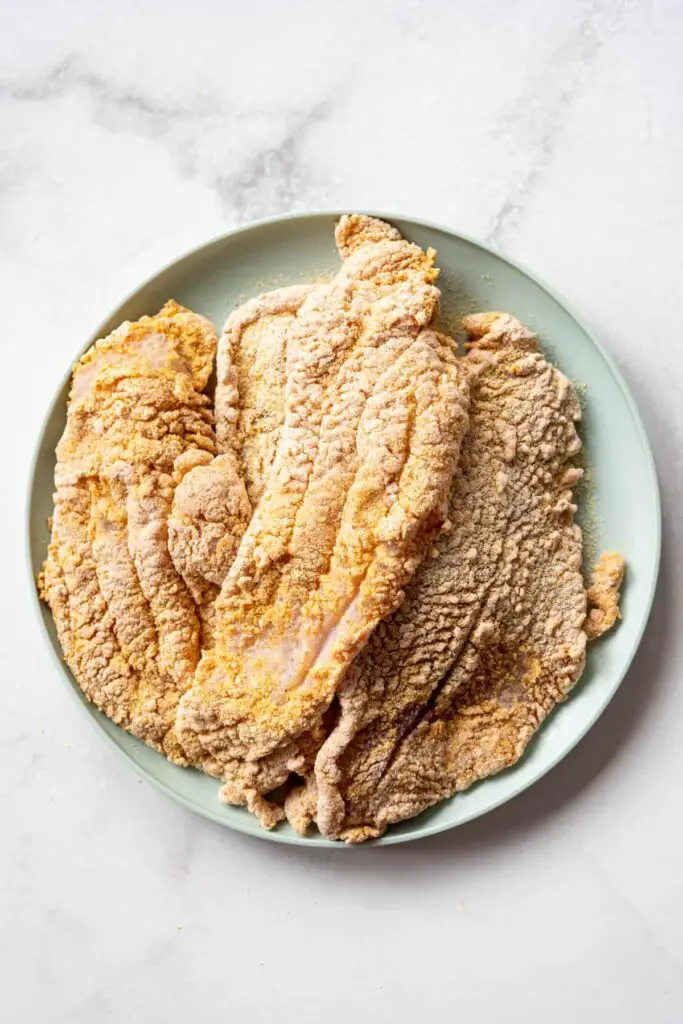 1. Soak the catfish in buttermilk. Start by seasoning the catfish fillets with some kosher salt, then cover them with buttermilk to soak for at least 10 minutes but up to 8 hours. You could also use an egg wash with beaten eggs and milk instead, but in my experience the breading sticks better with buttermilk and I love the tangy flavor.