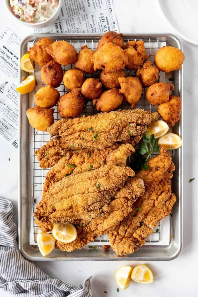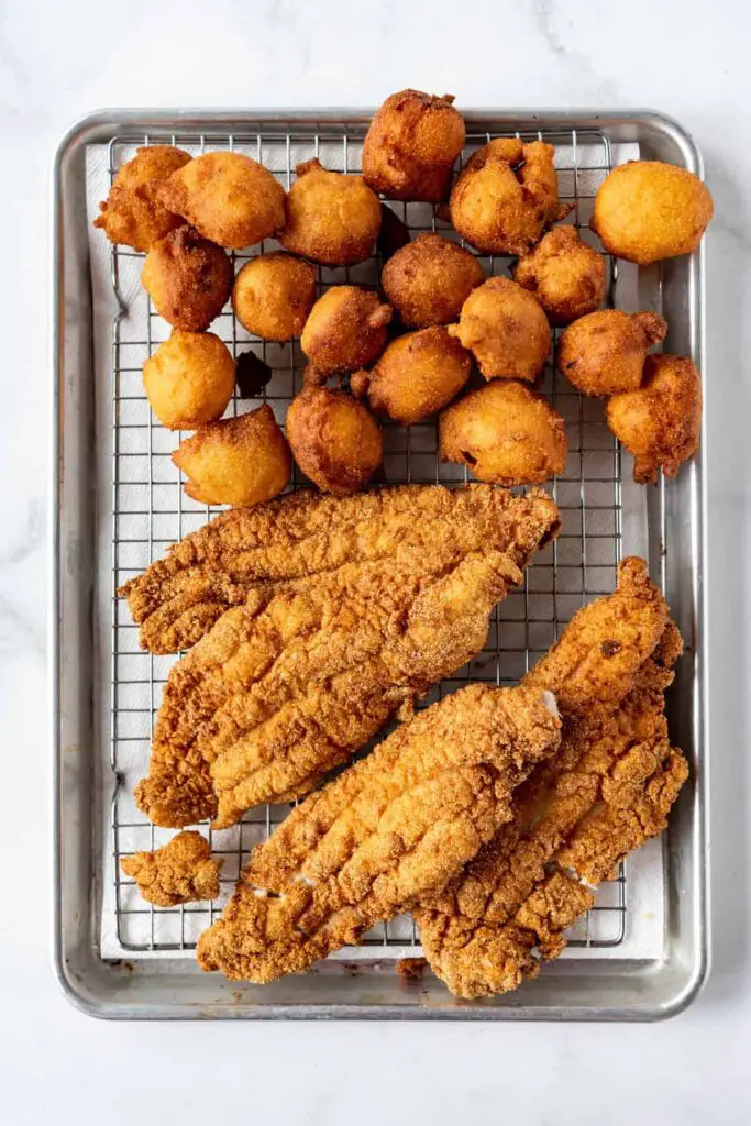 - Transfer the fried catfish to a baking sheet lined with a wire rack and place in a warm oven (225 degrees F) while frying the remaining catfish pieces.