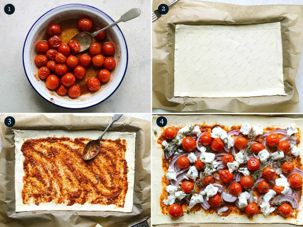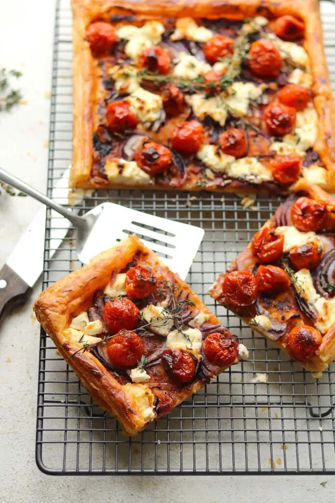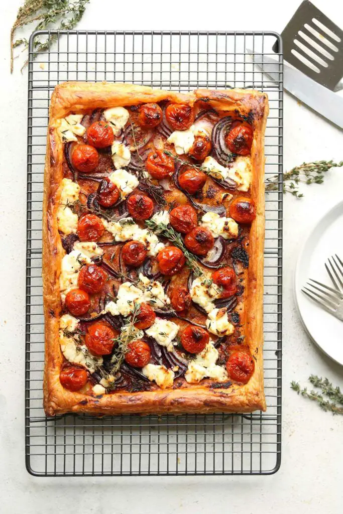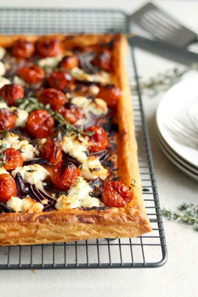 - Scatter the red onions over the pesto, then add the roasted cherry tomatoes and crumble the goat’s cheese over the tart. Finally, scatter some fresh thyme leaves over everything then add a drizzle of olive oil. Bake until the pastry is golden.