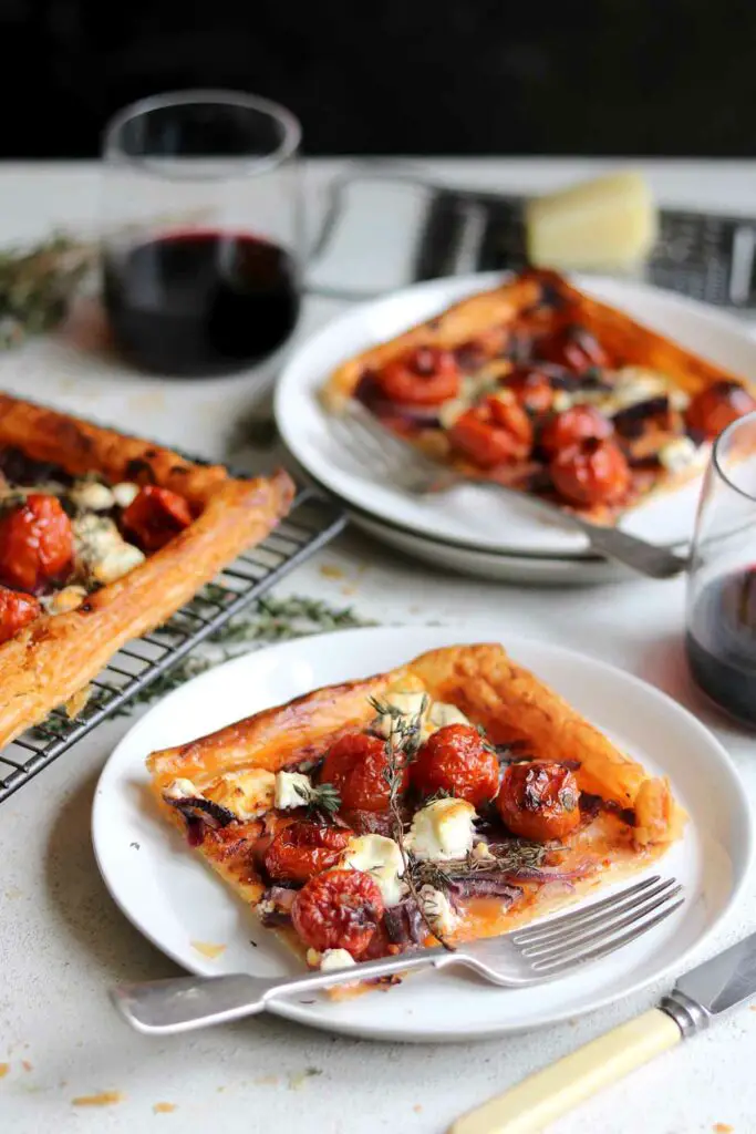 Goat's cheese tart with balsamic roasted tomatoes, a quick and easy dinner for busy weeknights. Made with puff pastry and lots of creamy goat's cheese.