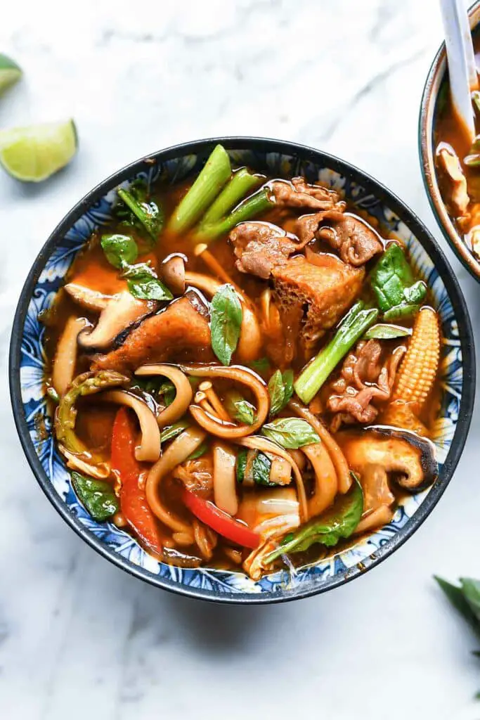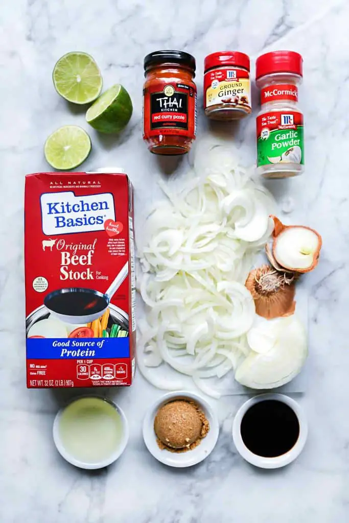 Add more or less red curry paste to this beef stock based broth depending on your desire for spiciness and add a squeeze more lime to balance the heat and flavors.