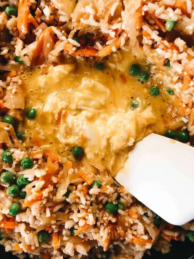 - Eggs: Make a well in the center and add the eggs. Scramble the eggs in the center of the pan and then mix them throughout the rice.
