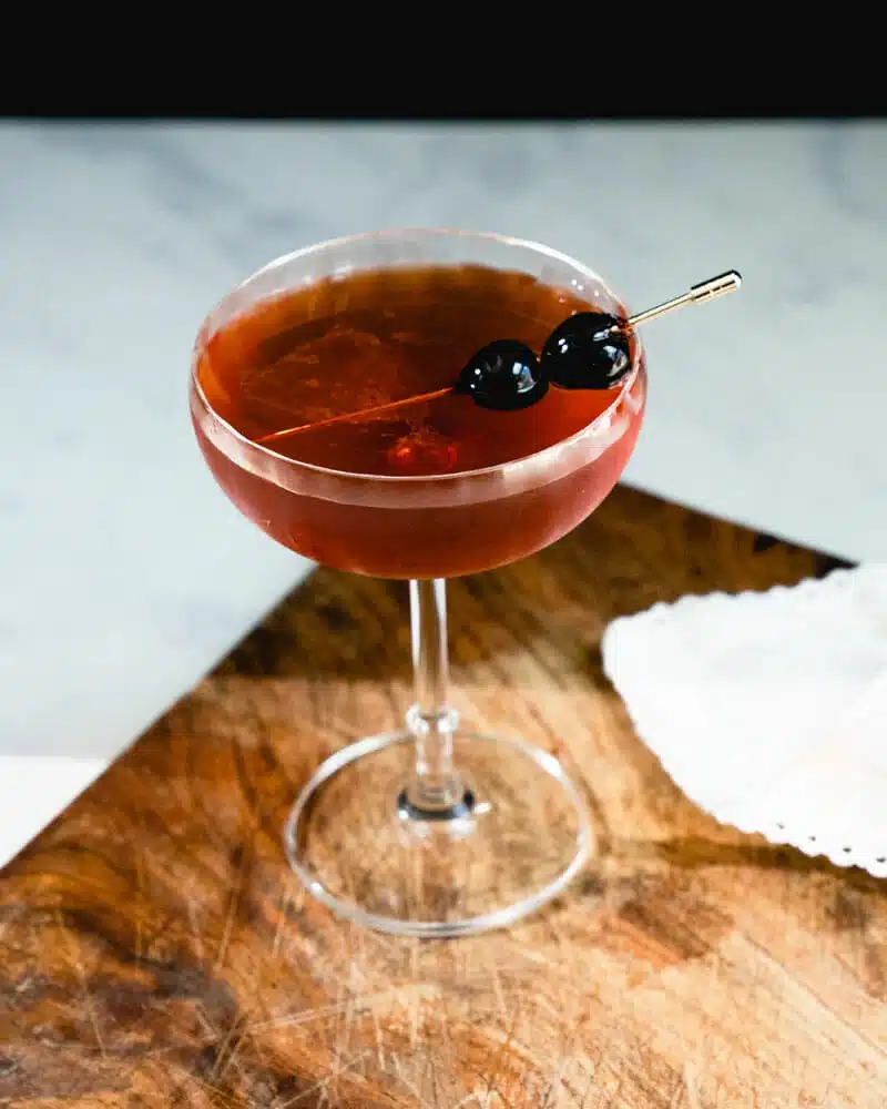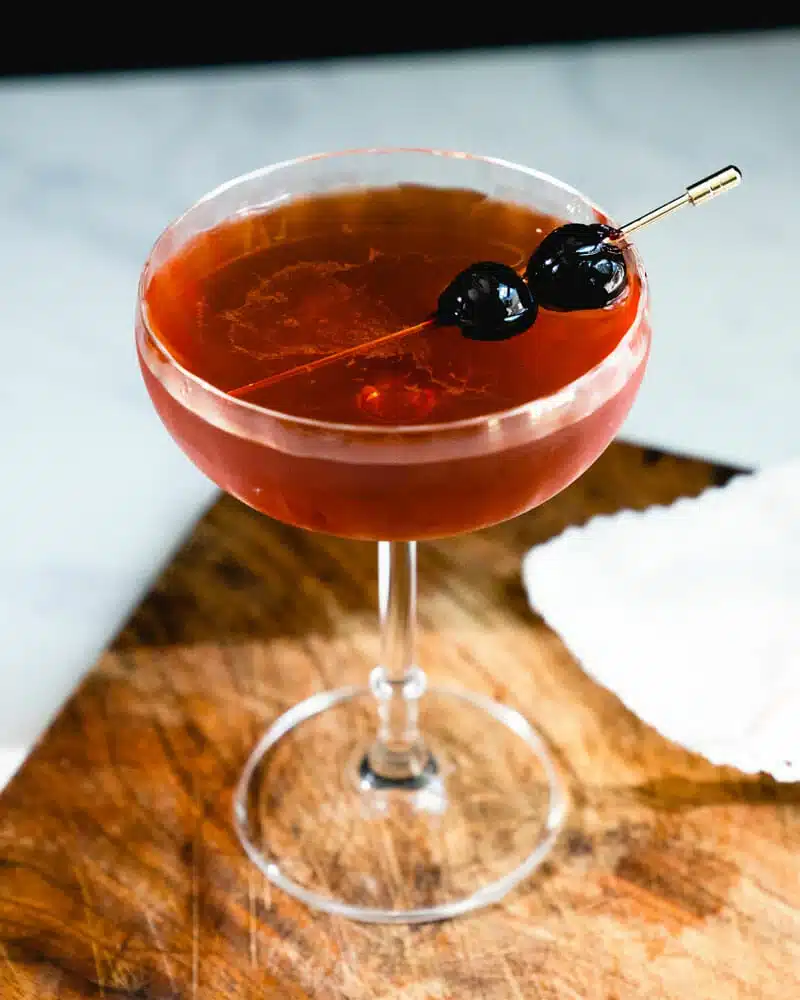 - Strain the drink into a cocktail glass. Garnish with a Luxardo cherry.