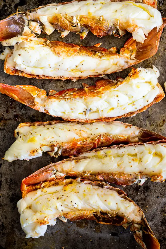 - Halve the lobster tails (or crayfish) with a sharp knife then place, flesh-side up, on a baking sheet.