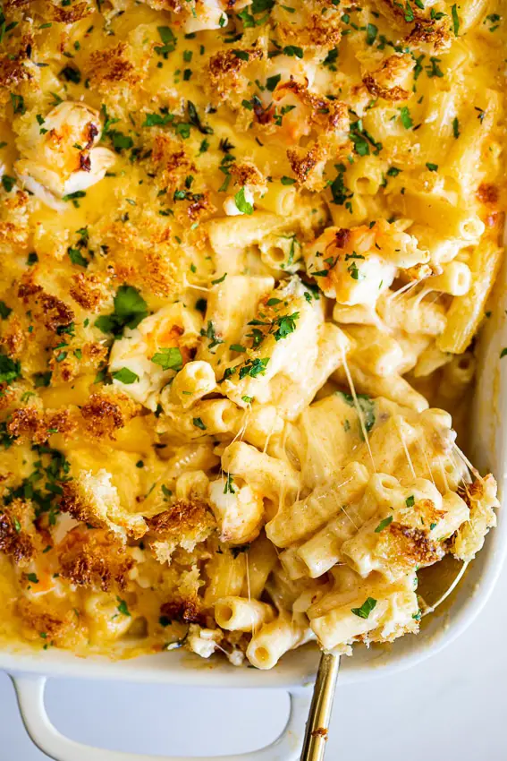 The cheesiest lobster mac and cheese topped with Parmesan thyme ciabatta breadcrumb topping is an indulgent recipe ideal for any celebration. The creamy, incredibly cheesy sauce is made with Gruyère cheese and sharp cheddar cheese and folded through al dente pasta and chunks of juicy lobster. Who could say no to that?