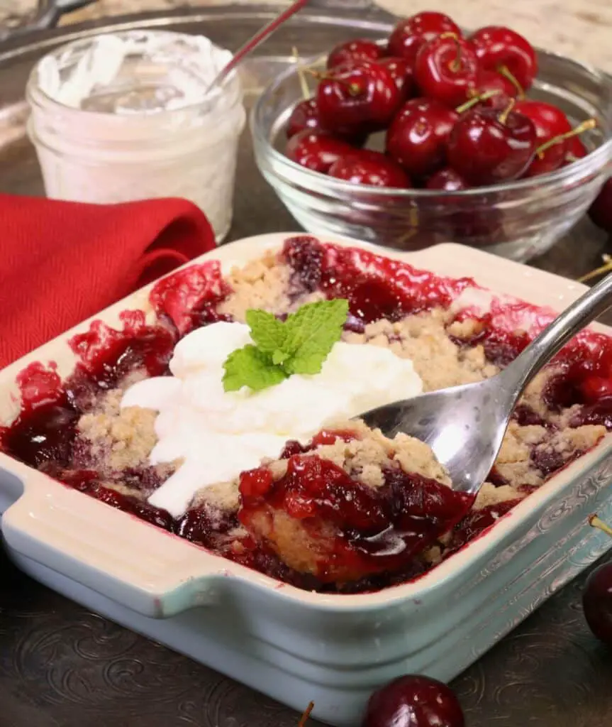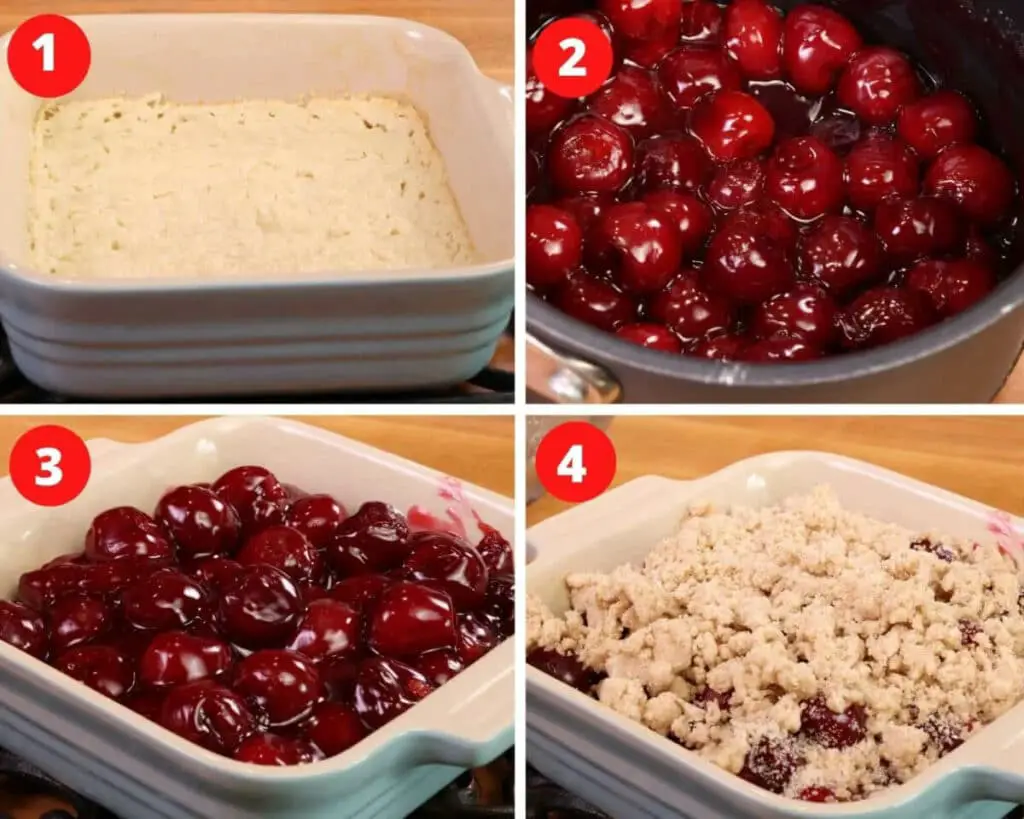 - Spoon the topping over the cherries and place the baking dish on a baking sheet. Bake for 35-40 minutes, until the filling is bubbly and the topping is golden.