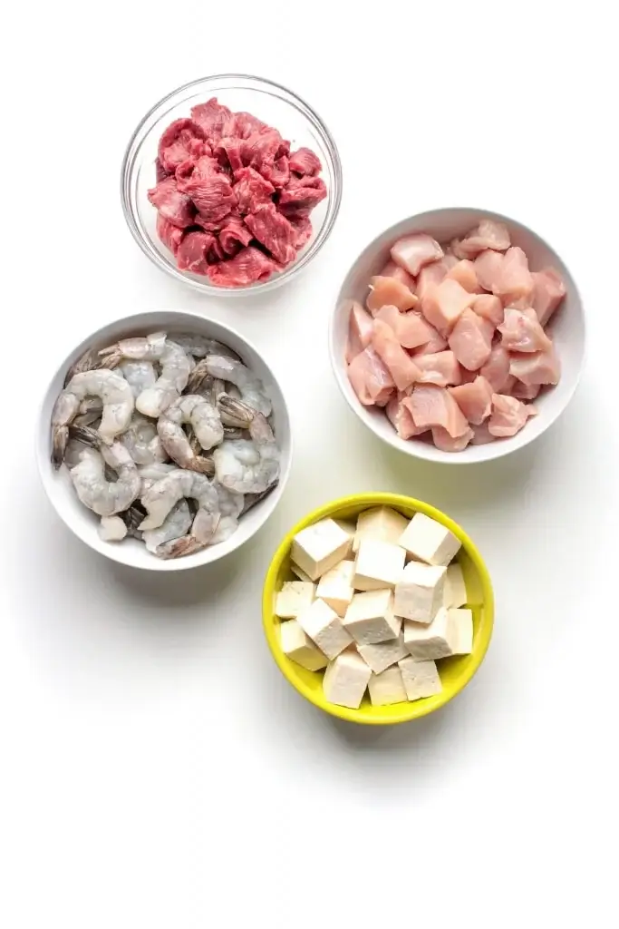 I usually choose between shrimp, diced chicken breast, sliced beef, and cubed tofu based on what I’m craving, what we have to use up in the freezer, or what’s on sale!