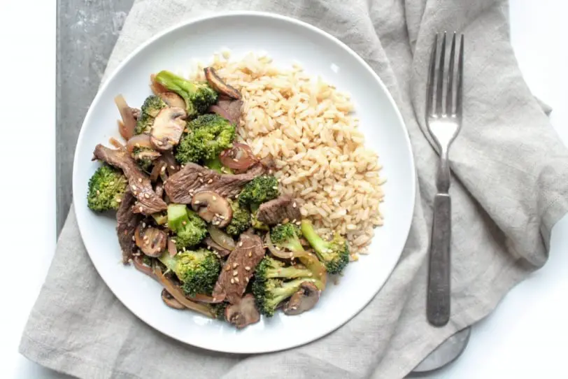 Beef Stir Fry with Ginger Soy Sauce, Broccoli, Mushrooms, and Onions over Brown Rice
