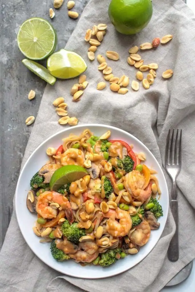 Shrimp Stir Fry with Peanut Sauce, Broccoli, Mushrooms, Peppers, Onions, Mushrooms, and Brown Rice Noodles with Peanuts