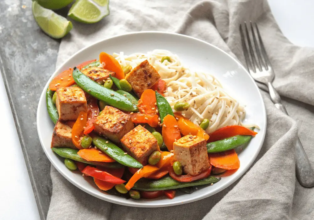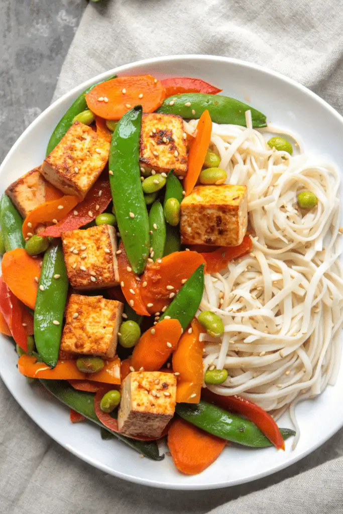 Tofu Stir Fry with Sriracha Sauce, Carrots, Peppers, Edamame, and Snap Peas over Brown Rice Noodles