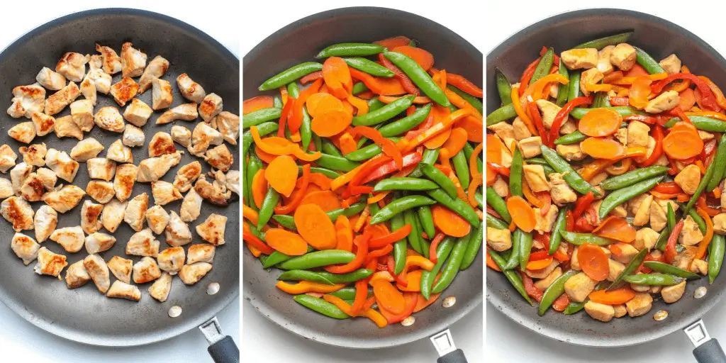 I like to do this first so that you can get nice caramelized edges on your protein and don’t have to worry about tossing raw chicken into cooked veggies later on.